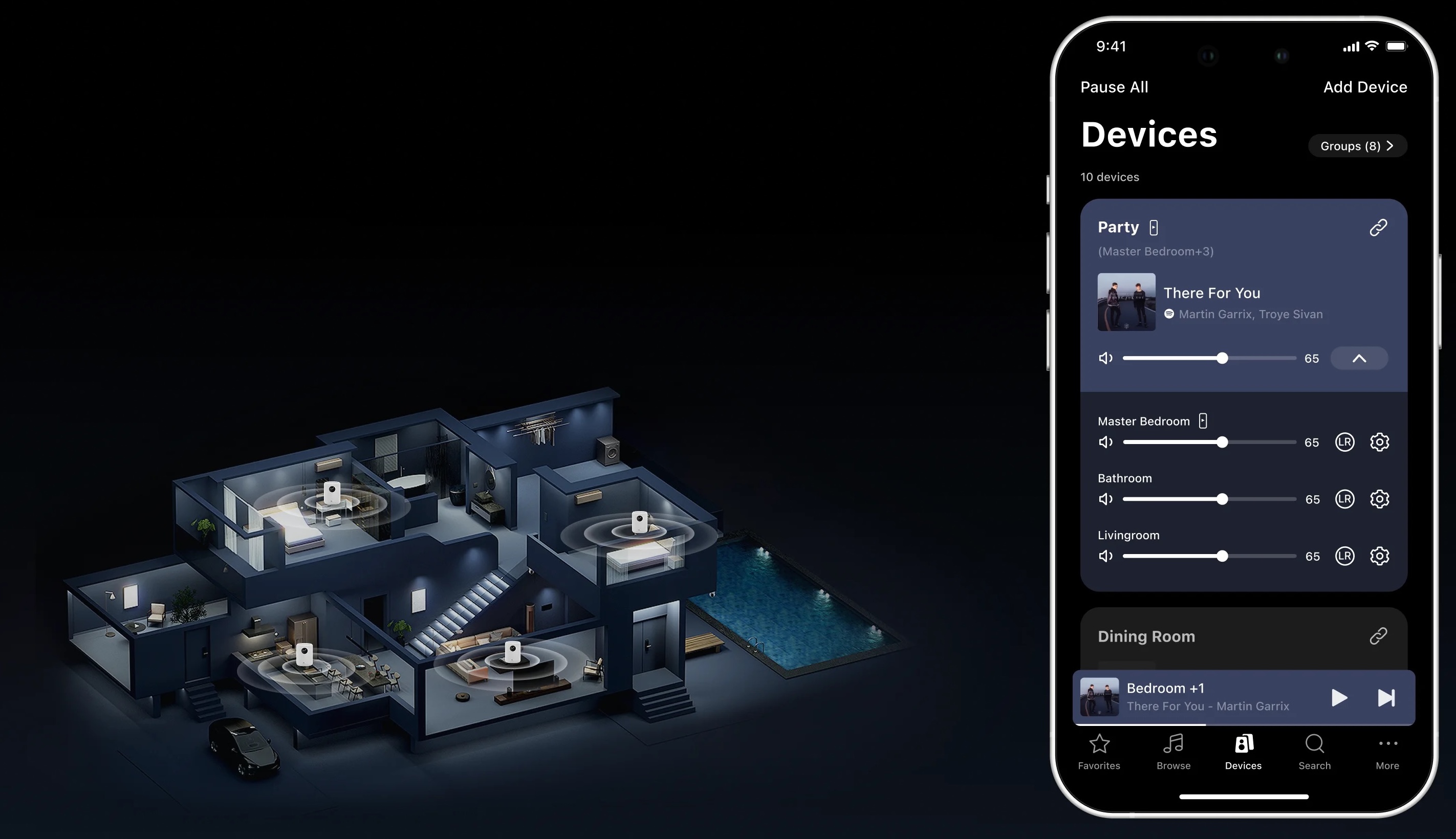 Každá místnost v dokonalé synchronizaci Seskupte reproduktory, synchronizujte hudbu napříč místnostmi nebo vytvořte v každém prostoru jedinečnou atmosféru. Pomocí aplikace WiiM Home můžete ovládat přehrávání a hlasitost v jednotlivých místnostech a přehrávat externí zdroje zvuku v celém domě. |