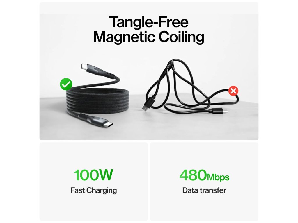 • Magnetic stacking keeps the cable organized during charging and data synchronization.
