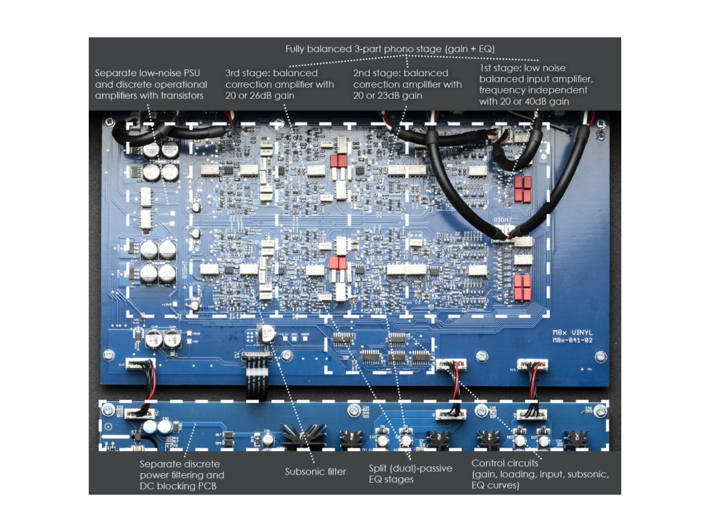 Ekvalizační obvod M8x Vinyl rozhodně nešetří na detailech – je zcela pasivní a rozdělený do dvou samostatných sekcí(tzv. split-passive). Tento způsob je sice náročnější na návrh i realizaci, ale zajišťuje nejpřesnější průběh ideální EQ křivky. Rozdělení na dvě fáze umožňuje lepší přizpůsobení impedance a minimalizuje odchylky od požadované ekvalizační charakteristiky. Kromě běžné RIAA křivky podporuje M8x Vinyl také méně obvyklé DECCA a COLUMBIA.