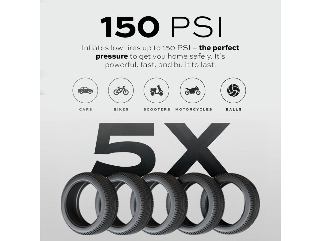 Možnost nafouknout až do 150 PSI – ideální pro většinu pneumatik (automobilových, motocyklových, kol) i jiné nafukovací vybavení.